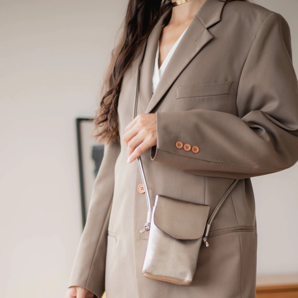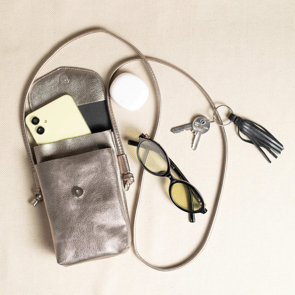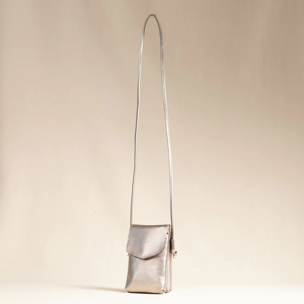 Bolsa tira colo, com fecho em botão. Tem o tamanho perfeito para colocar o essencial celular e carteira.