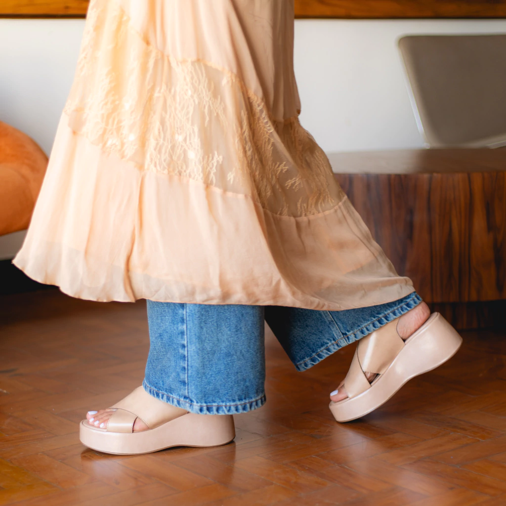 A Plataforma Seraya traz elegância e praticidade para o dia a dia. Confeccionada em napa, conta com tiras largas cruzadas e fechamento com fivela ajustável no tornozelo. O salto anabela, garante leveza e conforto ao caminhar, enquanto o design clean combina com produções casuais ou mais refinadas. Um modelo versátil para te acompanhar em todos os momentos.
